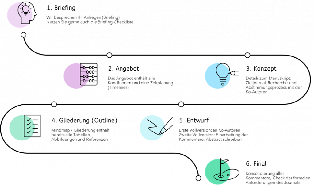 Konzept: Im ersten Schritt stimme ich mit Ihnen das Publikationskonzept ab. Es enthält alle Details rund um das Manuskript: Festlegung des Journals, Kommunikationswege mit dem Hauptautor und den Ko-Autoren. Falls beauftragt, wird hier die Literaturrecherche-Strategie ausgeführt. Ebenso werden die Story und die Hauptaussagen des Manuskriptes festgelegt.